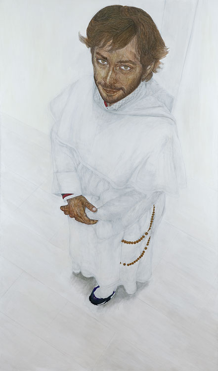 Un visage, des mains, des pieds, voilà ce qui seul accroche le regard dans les grandes plages blanches de la toile. Pas de voyeurisme, pas de révélation exotique, seulement ce qu’il y a à voir de plus important chez ces hommes de foi engagés à la suite de Saint Dominique auxquels l’artiste a voulu rendre hommage.