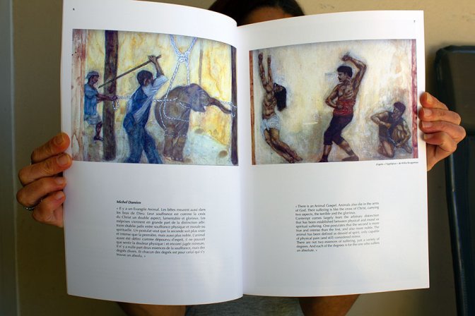 Cette réflexion s’inspire, entre autres, de la pensée d’Andrew Linzey et de l’approche Orthodoxe. Les dessins montrent le parallèle entre le souffrance du Christ, un innocent mis a mort et celui de la souffrance des animaux, eux aussi innocents et mis à mort. « La Passion Animale » est une confrontation d’images de presse sur la maltraitance animale, avec des scènes de la Passion du Christ ou de Flagellation, Portement de Croix, Crucifixion.... faites par Ribera, El Greco, Velázquez, Tiziano, etc.